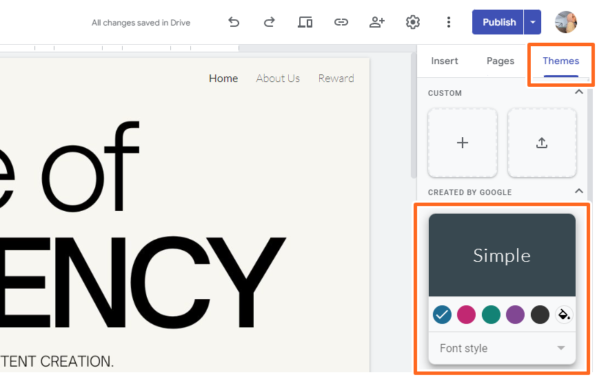 - Tema: Pilih themes/tema daripada panel sebelah kanan untuk menetapkan rupa dan rasa tapak web anda.