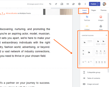 - Tambahkan kotak teks, imej, pautan benam dan elemen lain dengan menyeret dan melepaskannya/dropping ke dalam tapak anda.