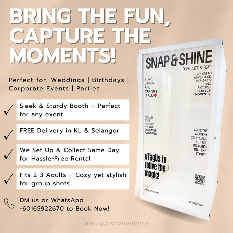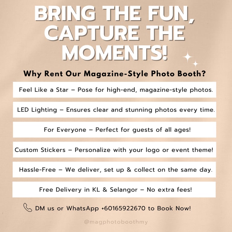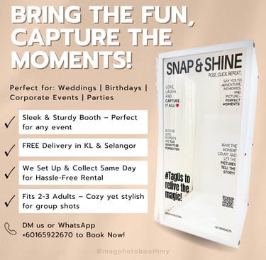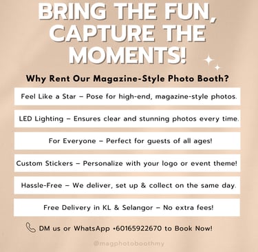 Mahu sesuatu yang istimewa untuk menceriakan majlis anda? Magazine-Style Photo Booth kami adalah pilihan terbaik untuk majlis perkahwinan, acara korporat, parti ulang tahun, dan banyak lagi! Direka untuk memberikan pengalaman fotografi interaktif & eksklusif, tetamu anda dapat mengambil gambar berkualiti tinggi sambil berasa seperti bintang majalah terkenal.